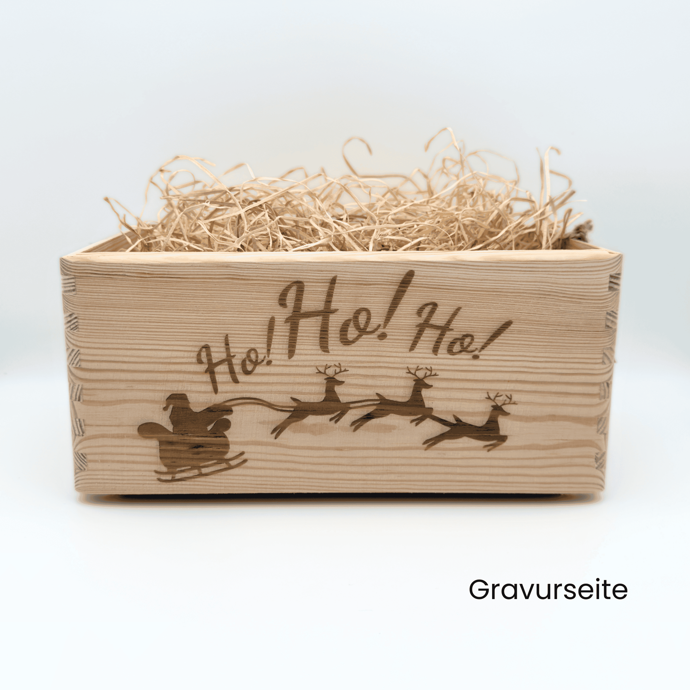 Die Holzkiste aus Kiefernholz ist einseitig gelasert mit dem Schriftzug "Ho! Ho! Ho!" sowie der Abbildung eines Weihnachtsmannes im Rentierschlitten und ist daher eine schöne Verpackung eines Präsent zur Weihnachtszeit.