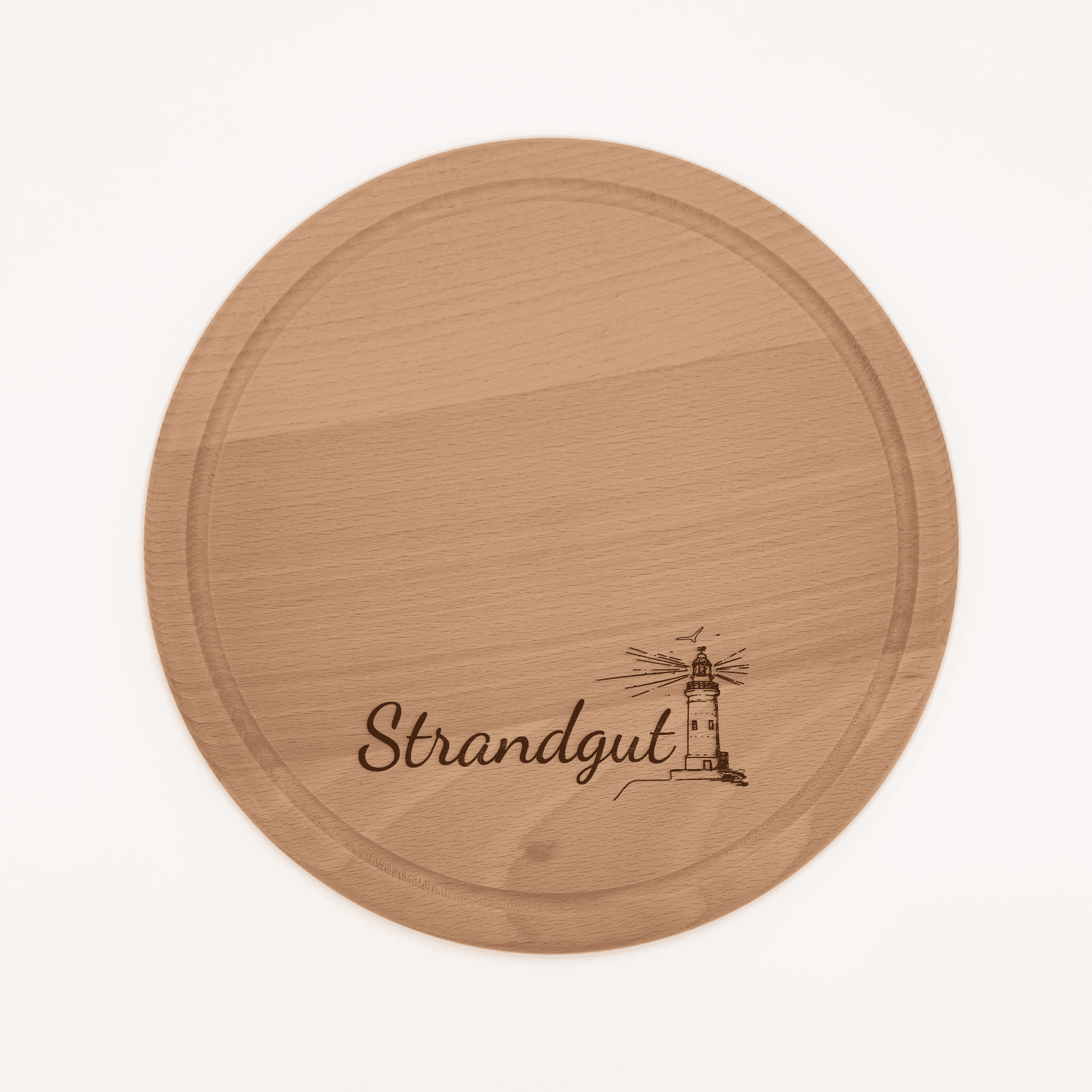 Dieses runde Schneidbrett aus naturbelassenem Buchenholz ist ein sehr nützliches Küchenutensil für den täglichen Gebrauch oder zur Dekoration. Durch das gravierte Motiv der eines Leuchtturmes und dem Schriftzug "Strandgut" denken Sie beim Kochen an die schönen Erlebnisse und Orte an der Küste.