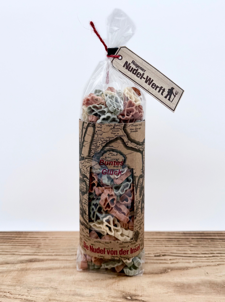Unser "BUNTES GLÜCK" ist eine Mischung aus folgenden Variationen: Natur-, Spinat- und Paprikanudeln. In diese Mischung kommt nichts außer Hartweizen, Wasser, getrockneter Spinat und Paprika (edelsüß). Damit ist das Grundprodukt für Ihre Lieblingsgerichte bereits dezent gewürzt und erhält eine ansprechende Farbmischung. Ein einfaches Gericht wird durch unser "buntes Glück" enorm aufgewertet.